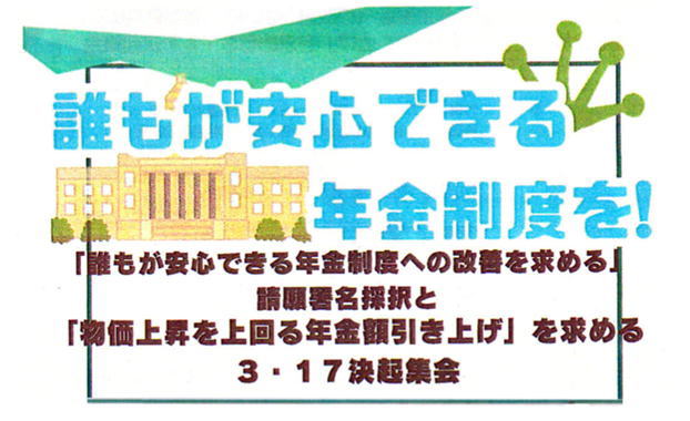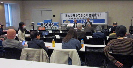 さらに、将来の低年金、無年金を増大させる空洞化問題≠ネど、無年金・低年金を放置してきた ことに、「まずは、年金給付水準の引き上げや抜本的な政策の転換が必要だ」とし、 「減らない年金の 仕組みの確立、最低保障年金の創設、積立金の計画的活用などと合わせて、 国レベルでの莫大な防衛 費削減、不公平税制改革」などを示し、「当事者として地道な運動に はなるが展望は開ける」と激励 し終了。岩崎勇中央本部執行委員の閉会あいさつの後、 衆参国会議員に対して紹介議員の要請に巡りました。